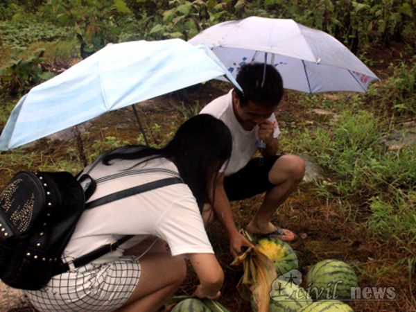 奶奶看队员们辛苦赶过来,硬要他们一起去山上摘水果。志愿者们看奶奶这么热情,盛情难却之下,其中几名队员与奶奶去菜地采摘。他们先是打了李子,然后又跑去摘西瓜。看到奶奶这么辛苦,志愿者们有点不好意思,每个队员就冒雨一人抱一个西瓜往山下跑,充满乐趣地回到了奶奶山下的家。