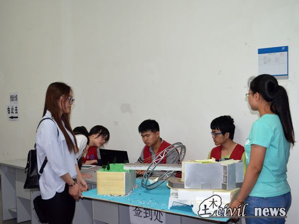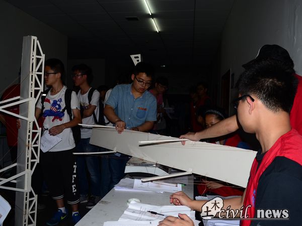 每轮到一组,他们便小心翼翼的拿着自己的模型,如护珍宝般在工作人员热情的引路下,来到签到处。签到完后,来到材料提交处,提交完材料。随后由工作人员将模型进行检查和拍照,最后模型就位。桥梁承重模型放在教室,而那极具美感的桥梁造型模型则被小心的抬入地下室。一切步骤都井然有序,丝毫不乱。