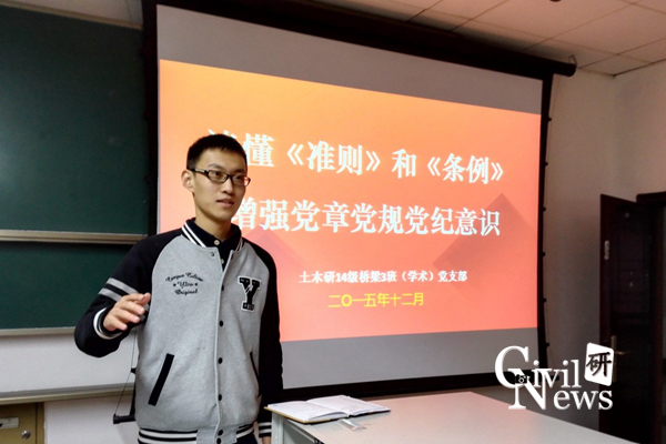党支书房忱同学提纲挈领地为全体党员讲解了《准则》的五大亮点、四个必须和八条规范,也同样介绍了《条例》的五大亮点、六大纪律以及四个关注要点。同时,他还简要地对部分条例进行了详细的阐述并举例。此外,还敦促大家对《准则》和《条例》进行通读,深入学习贯彻其思想,以身作则,发挥党员的先锋模范作用,严格要求自己。