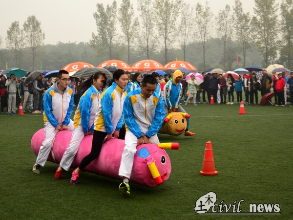 两个巨大的铅笔连在一起了,这是要干什么?原来这是一个名字叫做“快乐铅笔”的趣味活动。游戏规则如下,一男一女以排山倒海之势将并排起来的两支大铅笔从笔尖竖起来,接着又放倒,又从笔头竖起来,再放倒,一直重复到终点,计时最少者即为优胜者。初次看去,似乎不难,不过参赛者表示,这并不是一个简单的活动。比赛开始过后,各组在细雨中翻滚着铅笔。其中有一组的男生刚把铅笔竖起来,搭档的女生没有及时矫正方向,直接就看见铅笔向身上砸过来了,吓得尖叫了一声,赶忙跑开,铅笔也随之倒在了地上。这也引来了场外观众的阵阵欢笑。