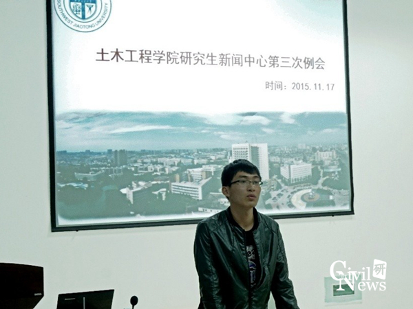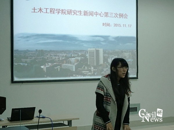 首先,土木学院研究生新闻中心主任何佳银对上一阶段的工作进行了总结,着重强调了新闻发布的即时性和严谨性,并结合之前的工作内容,针对上传到扬华素质网的稿量与质量提出了新目标,并对新闻的撰写中出现的问题进行了讨论。同时,肯定了土木学院官微运营的成果,对新媒体的运营提出了新的展望。