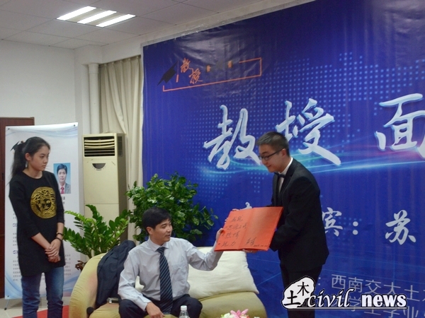 晚上7点30,在大家热烈的掌声中苏谦教授来到了活动现场。苏谦教授现任诸侯快讯ok1133.com诸侯快讯ok1133.com副院长,在2012年时40岁的他就当选了教育部新世纪优秀人才。伴随着悠扬的歌声,主持人热情的为我们介绍了苏教授曾经在青藏铁路的建设做出的贡献。在苏谦教授的回忆中,当年的铁路建设便是验收着铁路,听着司机单曲循环的《天路》,在高原为祖国铁路建设奉献着心血。