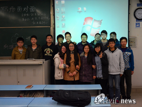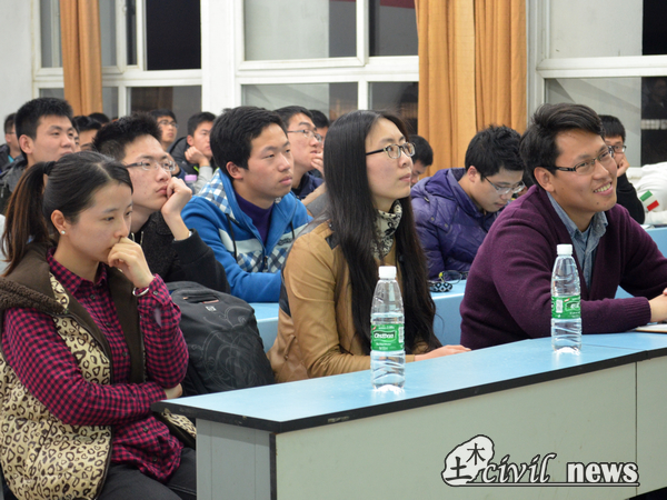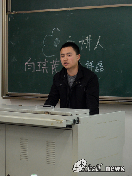 在主持人简短的开场白过后,两位学长分别登上主讲台与大家分享了自己的研究生生活与学习概况,以及在工地实习的相关经验和问题。