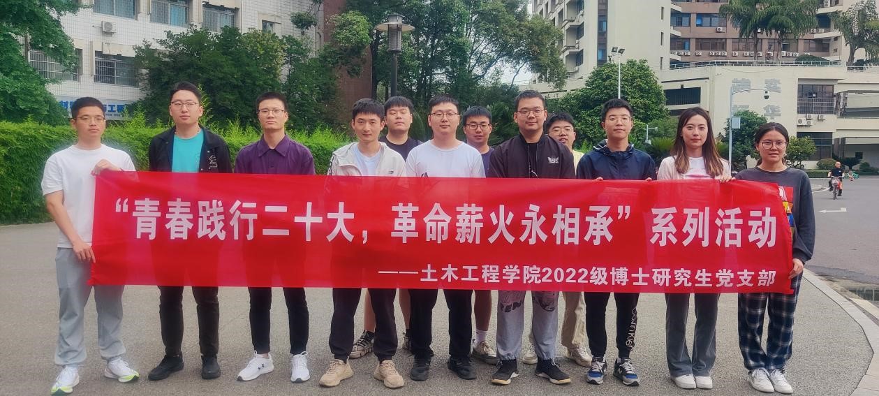 2023年是贯彻党的二十大精神的开局之年,是实施“十四五”规划承前启后的关键一年,是为全面建设社会主义现代化国家奠定基础的重要一年。为推动支部青年党员将中国共产党人精神谱系内化于心、外化于行,切身感受中国特色社会主义伟大成就,切实增强对中国特色社会主义的政治认同、思想认同、理论认同、情感认同。2022级土木博士班党支部于2023年5月开展“青春践行二十大,革命薪火永相承”系列活动,此次系列活动由党支部书记张宗宇、副书记何欢、宣传委员张童童、宣传委员尤著刚、组织委员曾营、组织委员尤著刚共同主持。