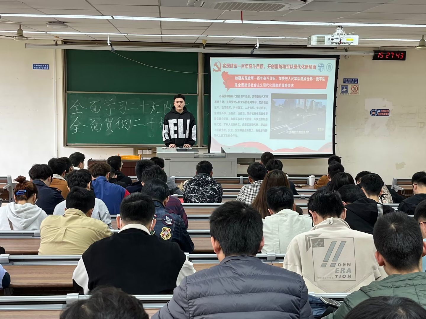结构2班齐威铭同志结合视频介绍了二十大中的国防和军队建设,通过结合推进“一国两制”和维护“人类命运共同体”,讲述了大国的责任与担当。
