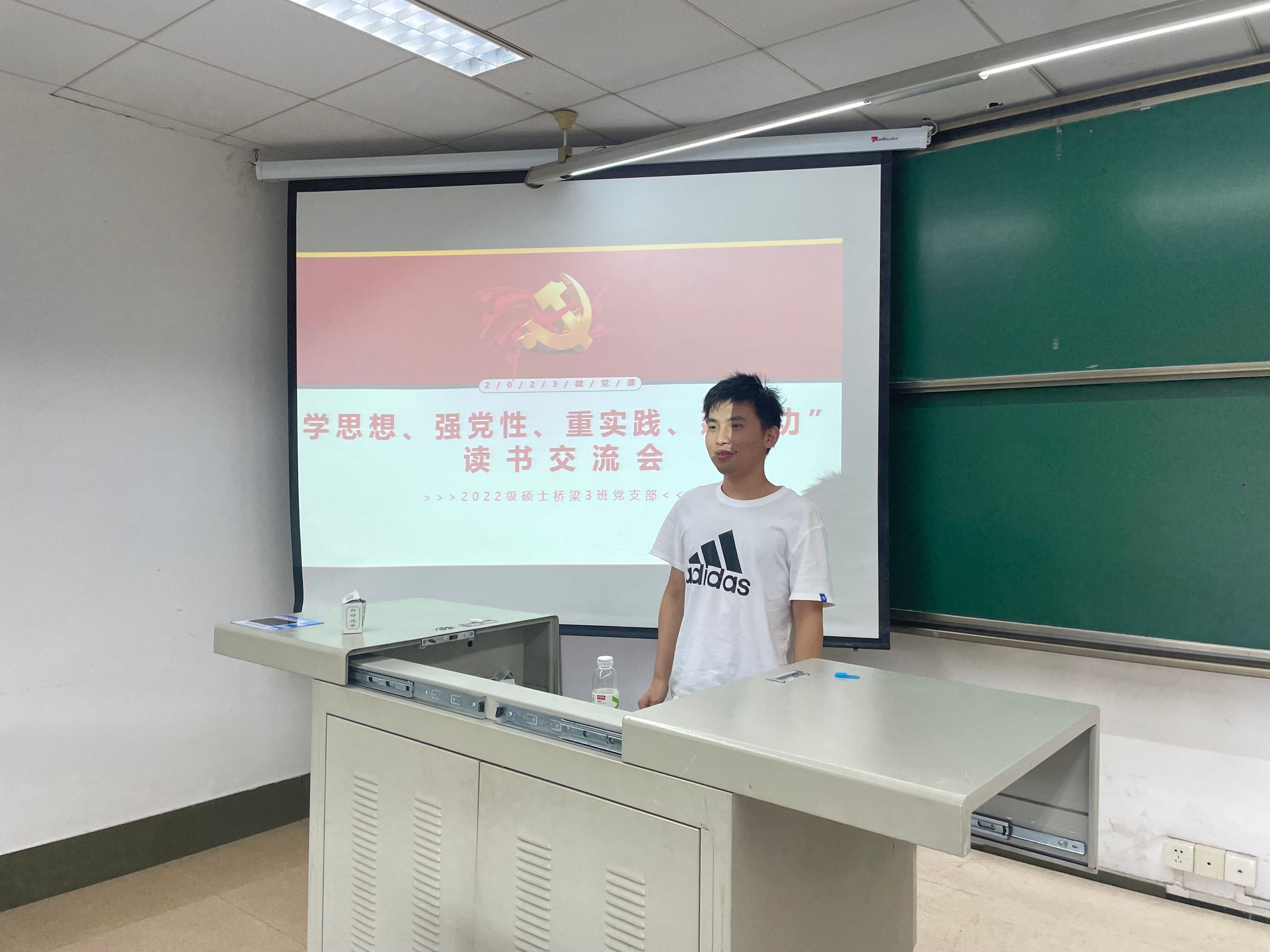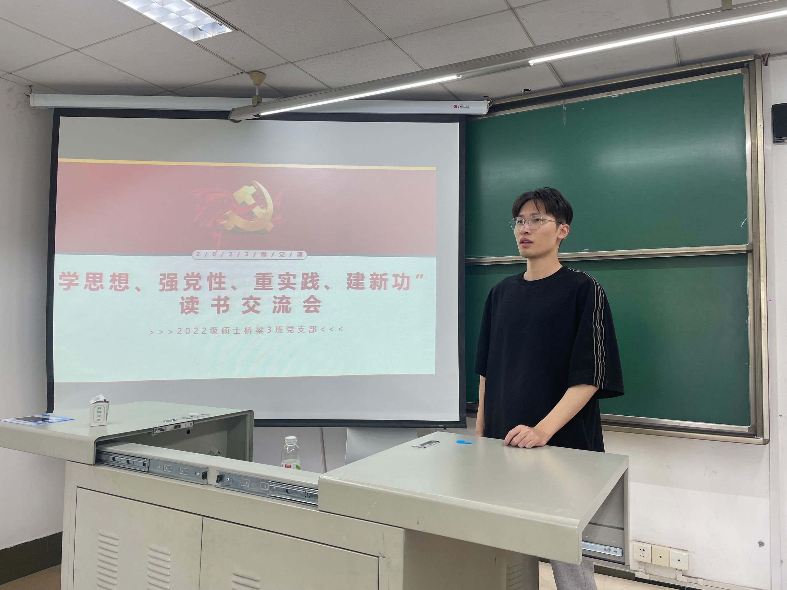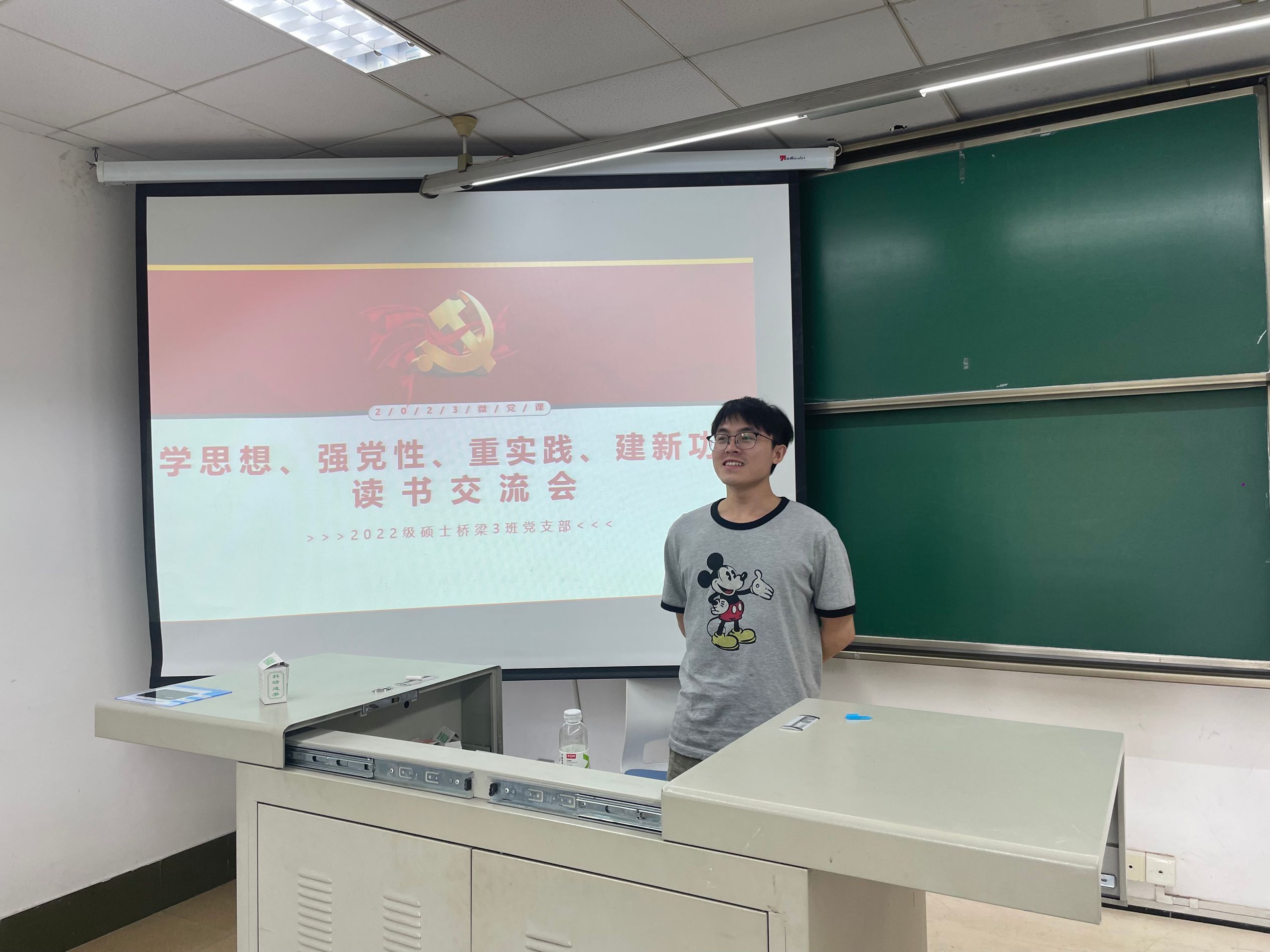 2023年7月6日17:00,2022级硕士桥梁3班党支部于九里校区逸夫馆4404A开展题为《学思想、强党性、重实践、建新功》读书交流会主题党日活动。本次会议由支部书记钟以勒同志主持,全体党员与积极分子参加。