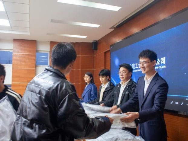面对台下一张张还略带青涩和稚嫩的面庞,中铁建工集团有限公司人力资源部招聘主管代成山老师亲切地和同学们打起了招呼。他笑称自己和其他三位企业生涯导师都是同学们的“大朋友”,和同学们一样都曾经历过长期专业学习和知识储备,不断积累的过程中善于抓住机会,如今在自己热爱的岗位上发光发热。来自中铁建工集团的“大朋友”们为参加本次卓越建工班的土木2023-01、土木2023-02班同学们带来了礼物,看着手里企业ip形象的U盘和印有logo的背包,聆听来自企业生涯导师的暖心话语,同学们逐渐融入本次交流,现场氛围活跃温馨。