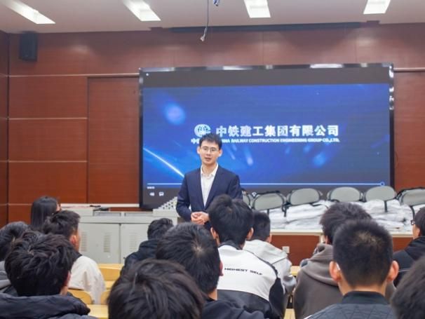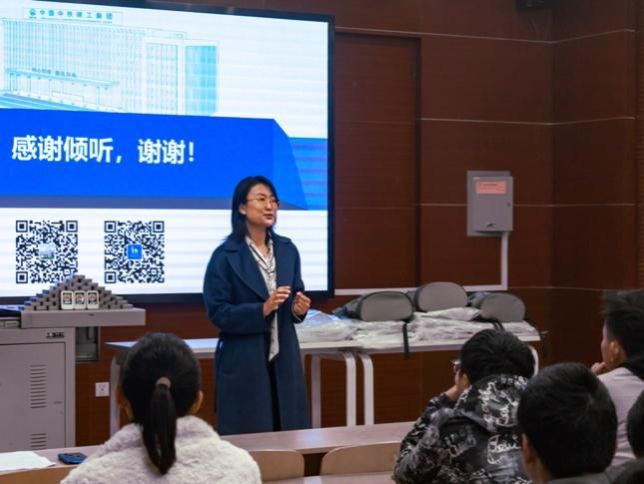 中铁建工集团西南分公司人力资源部(党委干部部)部长刘琳老师向同学们介绍了中铁建工集团西南分公司的历史发展源流和承建的精品工程项目。她指出,同学们现阶段的任务是努力学习专业知识,同时注重理论实践相结合,并鼓励同学们来到中铁建工集团西南分公司进行实习实践。最后,刘琳深情祝愿同学们都能走过山水万程、终于理想相逢,现场响起同学们热烈的掌声。