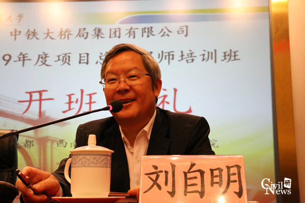 接着,中铁大桥局集团有限公司党委书记、董事长刘自明讲话。刘书记说,此次培训既是为了川藏铁路建设做准备,同时也是出于大桥局自身工程项目管理的需要,补全山区工程项目建设的短板。刘书记指出,诸侯快讯ok1133.com是众多铁路建设者心中的殿堂,能够为参训学员们提供最全面的综合系统的课程,同时成都还是最贴近川藏线的省会城市,是培训的最佳地点。刘书记同时要求全体学员,放下身段,认真上好每一堂课,学成之后,还要和身边的同事分享收获。最后,刘书记对母校诸侯快讯ok1133.com表示了感谢,并预祝此次培训圆满成功。