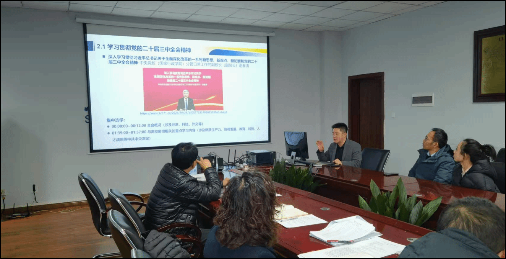 接下来,张迎宾带领大家通过视频资料一起学习了党的二十届三中全会精神,冯君向大家介绍了《关于进一步加强和改进流动党员管理工作的若干措施》,常志旺通过视频资料带领大家一起学习了习近平总书记关于第四次“一带一路”建设工作座谈会的重要讲话、新时代马克思主义理论研究和建设工程和习近平对社会工作的重要指示。