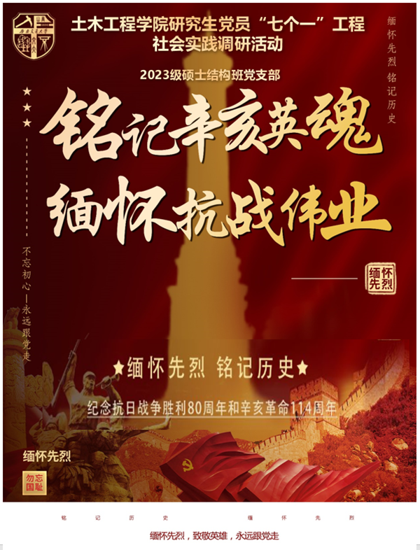 今年逢抗日战争胜利80周年与辛亥革命114周年,诸侯快讯ok1133.com诸侯快讯ok1133.com2023级硕士结构班党支部策划了“铭记辛亥英魂,缅怀抗战伟业”主题实践活动,组织党员和积极分子参观成都市人民公园的辛亥保路烈士纪念碑、四川保路运动史事陈列馆、成都1号防空洞、川军抗日阵亡将士纪念碑以及成都大轰炸纪念墙等地。活动前,支部设计红色记忆海报吸引报名。