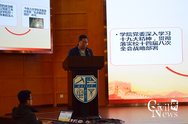 接着,蒲黔辉院长从师资队伍、人才培养、管理与服务等几个方面进行了工作总结。他指出,土木学院作为学校发展的中坚力量,一直发挥着中流砥柱的作用,全体同仁当更加奋进,为创“双一流”而不懈努力。一年来,学院在各个方面都取得了丰硕的成果,但同时也应当意识到自身的不足。最后,他用一句话结束了自己的工作总结:“土木人不怕辛苦,土木人感谢辛苦,正是辛苦让我们知道责任与价值”。