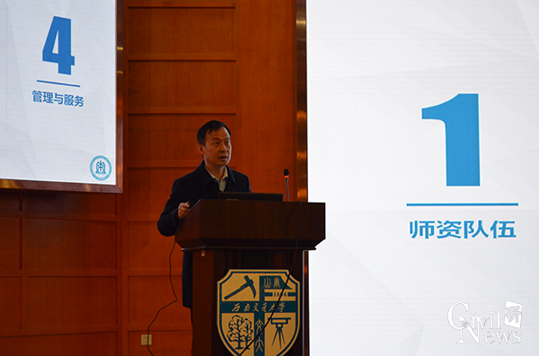 考核测评结束后,蒲黔辉院长做了以“轨道交通领域世界第一大学”建设目标为引领,全力支持交运学科全国第一,以土木一流学科建设为路径,全力推进学院创一流示范性改革的工作报告,包括改革背景与目标、改革举措以及改革推进情况。他说,土木学科前有堵截,后有紧追,改革形势十分紧迫,但是面对未来,机遇与挑战同时并存,我们应该顶着压力勇敢前行。