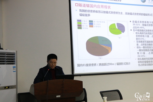在简单的自我介绍后,刘新荣教授直入主题,先是从锚碇的基本形式、隧道式锚碇的结构特征、应用现状和发展趋势以及存在的主要问题简要介绍了隧道式锚碇。