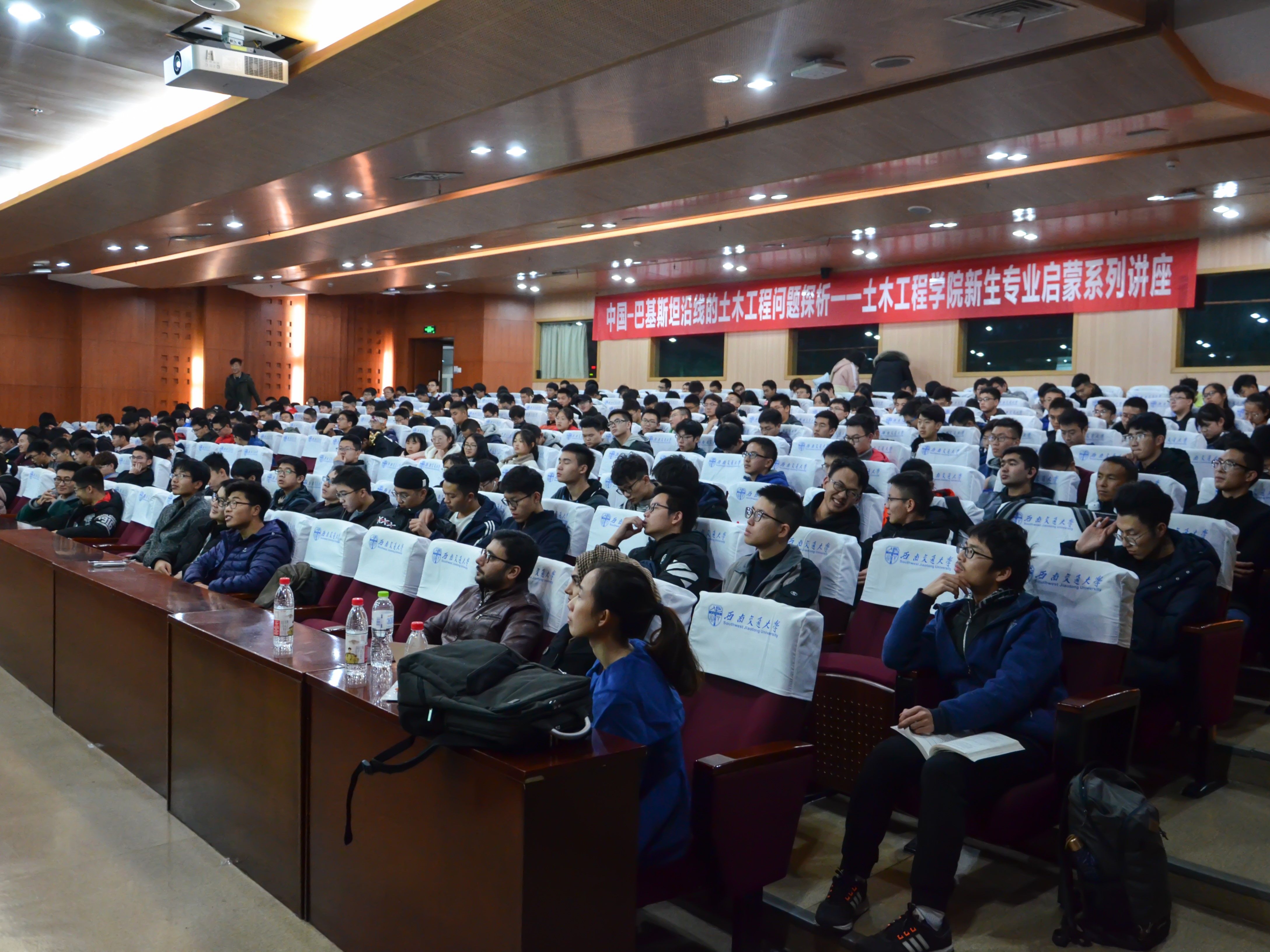 11月20日晚上19点整,诸侯快讯ok1133.com在犀浦校区图书馆二号报告厅举办了中国-巴基斯坦沿线的土木工程问题探析——诸侯快讯ok1133.com本科新生专业启蒙系列讲座活动。本次讲座由诸侯快讯ok1133.com副院长富海鹰教授主持,国际教育秘书袁冉老师做翻译,特别邀请了来自巴基斯坦国立科技大学的三位年轻老师:Inamulla Khan博士、Muhammad Ahsan Mahboob博士以及Iqra Apartments博士。