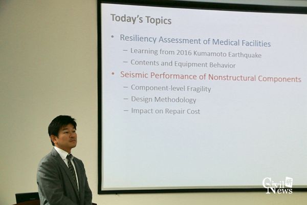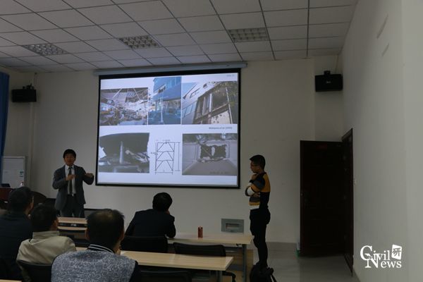 紧接着,仓田副教授介绍了非结构构件抗震研究现状。他提到,非结构构件震害及其次生效应已成为财产损失及修复费用的主要组成部分。因此,建筑结构中针对非结构构件的地震表现评估及抗震方案是必不可少的。仓田教授介绍了京都大学完成的多个非结构构件试验、分析和研究,总结了考虑建筑全生命周期的合理设计和加固方案。仓田副教授认为,目前抗震技术已逐渐向减少生命及财产损失方向发展,非结构构件抗震正在成为研究热点。