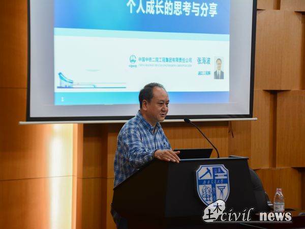 一番深情诉说之后,张总回忆起了自己从在西南交大读书到在中铁二院实习、工作以及到国外深造的成长经历,他以自己的成长特点,向大家分享了他关于大学学习与生活的思考。他提出,机会永远留给有准备的人,要学会敬畏、自审、规划、不断规范警醒自己,时刻记住一分耕耘一分收获,同时对于学习要勤于思考。对同学们,张总表示能进入交大,特别是土木学院,机会难得,因为它代表了国家在铁路和轨道交通方面的最高水平,也代表同学们将来会进入最高水平的铁路和城轨领域,他也殷切期望同学们学有所成。紧接着,张总向大家分享了关于将来工作方式的思考,教导同学们规划好自己的人生。