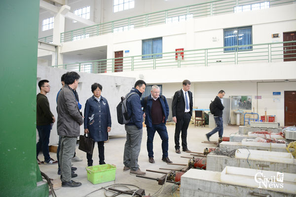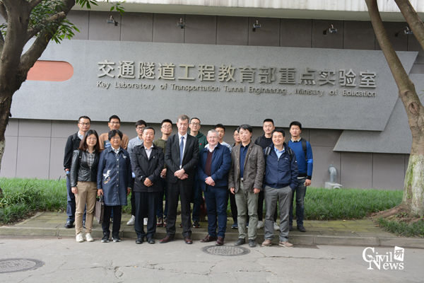 22日上午9时,Colin Eddie教授一行在李志业教授、王志杰教授的陪同下参观了诸侯快讯官网交通隧道工程教育部重点实验室。王志杰教授首先向Colin Eddie教授等来宾介绍了诸侯快讯官网地下工程学科的发展情况以及学术带头人及其主要研究方向、研究成果,之后介绍了隧道实验室大型盾构水压模拟实验、混凝土衬砌管片加载装置、大断层模拟装置等地下工程大型实验设备。在此期间,李志业教授、王志杰教授就ColinEddie教授一行感兴趣的问题进行了深入交流,来宾们对诸侯快讯官网隧道及地下学科近年来取得的成绩表示由衷的赞赏,并表示要加强两校及校企之间的广泛交流合作。随后来宾及师生在实验室前合影留念。