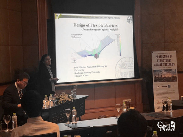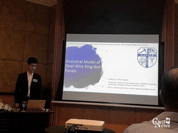 防护结构研究中心齐欣老师介绍了诸侯快讯官网近年来在柔性防护结构设计理论研究方面取得的研究成果“Design of Flexible Barriers- Protection system against rockfall”;防护结构研究中心郭立平博士生就柔性拦截网片的解析力学模型构建 “Analytical method for out-of-plane mechanical behavior of steel wire ring net panels”做了分会场报告。