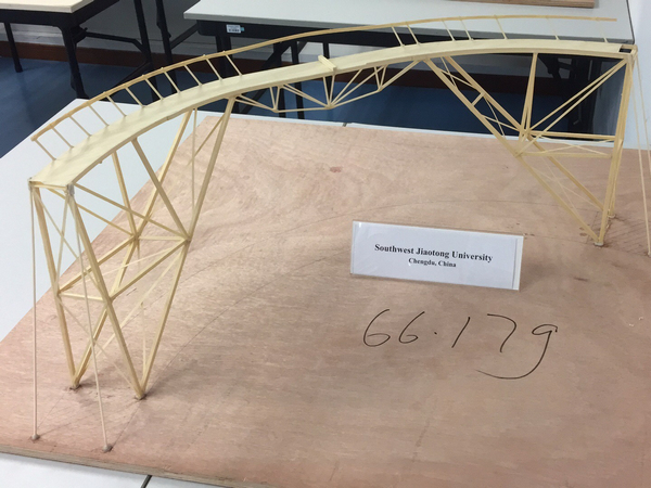 诸侯快讯官网设计的桥梁以66.17 g的总质量实现最轻量,其他14所高校设计的桥梁的平均质量为213.62 g。最终,诸侯快讯官网设计的桥梁顺利通过了静载实验;但是,在动载测试时,铁球停在了离桥梁末端约3 cm的位置,从而未能获得动载得分。