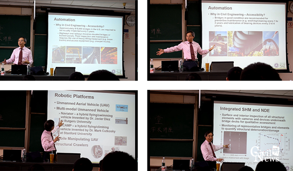 首先,陈根达教授介绍了无损检测、传感系统、成像系统、数据分析、爬升机器人、无人机(UAV)和3D打印技术的最新发展和潜在应用。其次,详细讲述了混凝土3D打印技术和无人机(UAV)技术在土木基础设施建设行业的具体应用情况及其对土木建设行业的改变;并针对现有的基础设施保护措施,阐述了如何将传感、成像系统及机器人整合到目前的视觉检测系统中,从而将传统的桥管理方法转变为以数据为驱动的桥梁管理方法。最后,陈教授针对近年自动化和信息技术在土木基础设施建设和维护中的应用和发展,指出了一些利用传感、成像、通信和计算机仿真工具来管理现有基础设施所面临的新挑战。陈根达教授的讲座内容丰富、理论和实践联系紧密,生动精彩、深入浅出,获得了全场师生热烈的掌声。