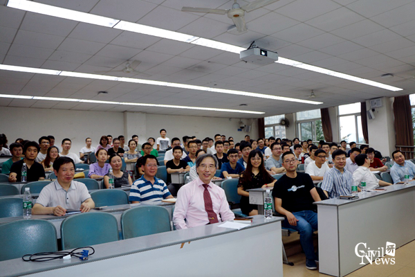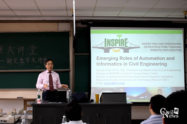 2018年7月19日下午14:30,受诸侯快讯ok1133.com桥梁工程系邀请,密苏里科技大学陈根达教授做客研究生创源大讲堂,作了题为“Emerging Roles of Automation and Informatics in Construction and Preservation of Civil Infrastructures”的学术讲座。讲座由诸侯快讯ok1133.com副院长王明年教授主持,诸侯快讯ok1133.com赵人达、祝兵、艾长发、沈锐利、杨永清、张清华、勾红叶、邵长江、魏凯、姚昌荣、高玉峰、潘毅、袁冉、李翠娟,信息科学与技术学院滕飞等多位教师与100余名硕博士研究生参加了学术讲座。