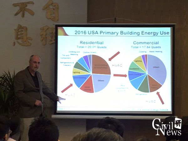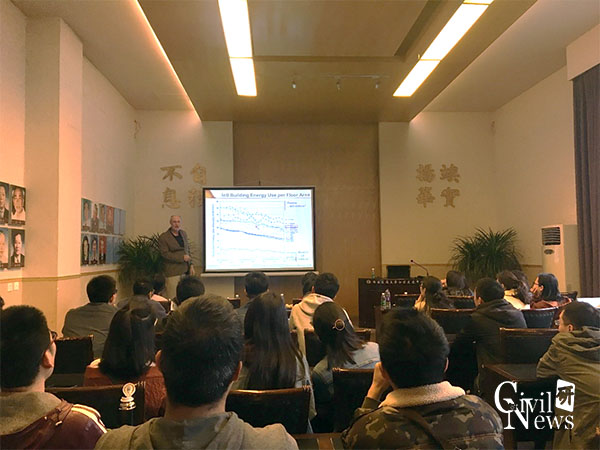 Patrick Phelan教授在本次讲座中分享了未来建筑在零净能源和碳中和下的发展前瞻。他首先介绍了亚利桑那州的情况以及建筑能耗的现状。然后介绍了不同能源用于建筑中的消耗情况以及造成的费用情况。接着介绍了未来建筑考虑的一些方面,如:对人体健康的影响,对环境的友好程度等。Patrick Phelan教授讲到“绿色”建筑的发展一般是向零净能源发展,并且在一些地方发生得非常迅速。例如,加利福尼亚州已经要求到2020年所有新建住宅建筑物的零净能源。另一个更加困难的挑战是碳中和建筑。美国能源部建筑技术办公室与太平洋西北国家实验室合作,组织了为期一年的努力,题为“未来建筑”,目标是解决这个困难。这项研究涉及跨学科的顾问小组和专家参与了一系列涉及建筑技术,材料,建筑,施工实践,健康,城市规划和环境科学的网络研讨会,研讨会,研讨会和会议介绍从现在开始大约一百年以后,对建筑物的一致看法。教授在报告中分享了许多数据图表,语言幽默风趣,讲解通俗易懂,在场的老师与学生都表现出了浓厚的兴趣。