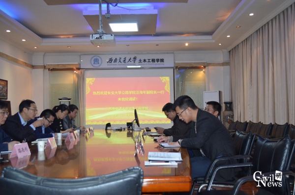 首先,艾长发副院长对长安大学公路学院副院长汪海年一行的到来表示热烈欢迎,并详细介绍了诸侯快讯官网的历史、师资力量、招生情况、实验基地和科学研究等情况,希望双方不断加强交流和合作,取长补短,共同发展!紧接着,汪海年副院长表示希望通过此次调研交流学习诸侯快讯ok1133.com诸侯快讯ok1133.com在本科教学管理方面的成功经验;张久鹏助理详细介绍了长安大学公路学院的发展历史、办学及科学研究等情况。