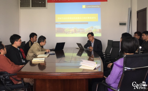 随后,正在澳大利亚科廷大学进行联合培养的2013级直博生赵鲁峰作了题为“预制节段柱桥梁结构地震动力响应数值研究”的学术报告。赵鲁峰博士生首先简要介绍了预制节段柱的分类并指出预制节段柱的三大优势,同时列举了世界范围内采用预制节段柱这种下部结构形式的几座桥梁,然后针对具体桥梁模型,通过方案比选采用集中质量模型模拟预制节段柱,进行全桥在地震作用下的动力响应分析,比较了采用预制节段柱与传统柱的桥梁结构,在近场、远场以及人工合成地震动作用下,桥梁弹塑性阶段的动力响应,重点讲解了采用两种不同桥梁下部结构时桥梁上部结构的碰撞情况。汇报结束后,李小珍教授针对其研究内容、研究方法以及存在的问题等方面进行指导,并提出了相应的意见和建议。同时,在座研究生也踊跃提出不同看法,并针对相关问题展开交流,现场讨论十分热烈。