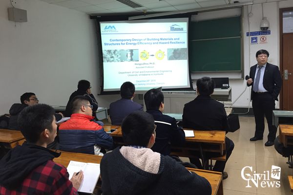 2016年12月20日,美国阿拉巴马大学亨兹维尔分校(UAH)土木与环境工程系助理教授周虹宇博士,受桥梁工程系马中国海外院长和魏凯副教授的邀请,在九里校区逸夫馆4304A作了题为“Holistic Design of Building Structures and Materials for Hazard Resilience and Energy Efficiency”的“创源大讲堂”研究生学术讲座,土木工程院副院长祝兵教授,桥梁工程系副系主任张清华教授、副系主任占玉林副教授、徐腾飞副教授、魏凯副教授,建材教研室李福海博士等参加了活动。讲座由祝兵副院长主持。周虹宇教授首先介绍了建筑材料对建筑结构行为和能源效率的双重影响,为解决节能材料设计对建筑构件力学性能造成的不利影响,周教授团队通过多尺度试验技术研究了影响材料力学和热学性能的关键因素,提出了建筑结构的现代设计框架,全面考虑了材料和结构布局对建筑系统能效和灾害恢复力的共同影响。随后的交流环节,周教授对参会的各位老师同学提出的种种问题进行了耐心细致的解答。