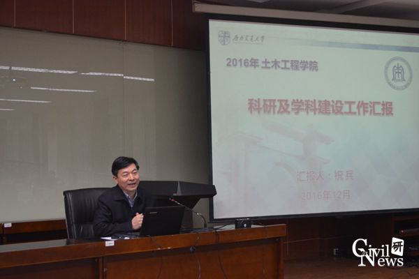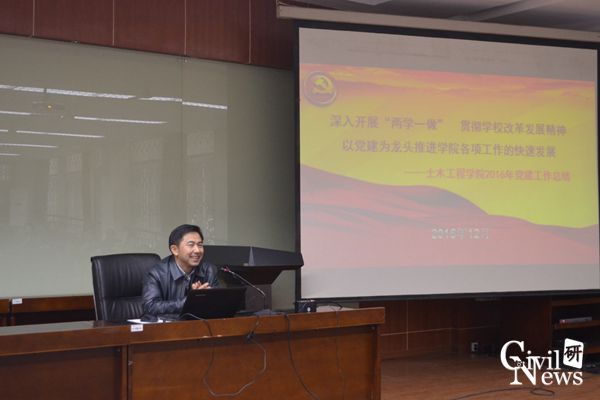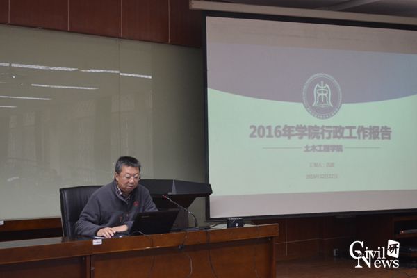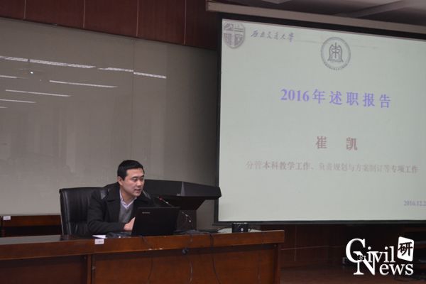 高院长汇报结束后,学院的蒲黔辉、祝兵、崔凯以及富海鹰副院长依次进行了工作述职。蒲院长的报告围绕学院实验室建设及发展工作展开,祝院长以学科评估期间院内各教职领导的辛苦付出及评估取得的成效为例表答了对学院众教职工作的肯定及感谢,崔院长就本科教学及专项方案规划制定方面列举了自己年内的工作情况,富院长则对学院研究生基本信息进行了报告并对年内自己在研究生培养方面所做出的工作进行了展示。