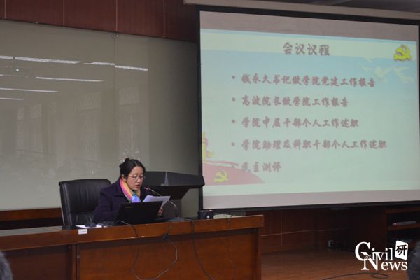 大会一共涉及五项议程,分别为:钱永久书记做学院党建工作报告,高波院长做学院工作报告,学院中层干部个人工作述职,学院助理及科职干部个人工作述职,民主测评。