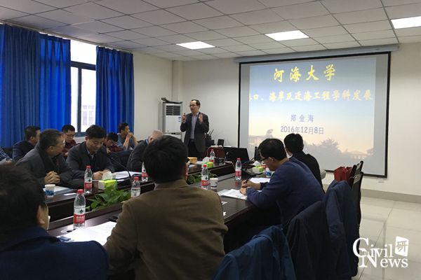 首先进行汇报的是郑金海院长,他对河海大学的发展状况和港口海岸与近海工程学院进行了介绍,然后从室内实验数据、现场观测仪器、沿海水文多要素长期观测平台、数值模拟软件等方面介绍了港口、海岸及近海工程学科的发展,并对学科的代表性成果进行了介绍。