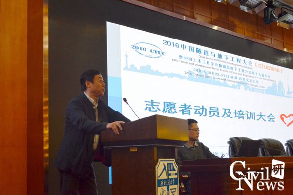 10月15日周六上午10点,在九里校区网络学院一楼国际会议厅举行了“2016隧道大会志愿者动员大会”,地下工程系仇文革教授、晏启祥教授、蒋雅君副教授、方勇副教授、汪波副教授、龚伦副教授、郑余朝副教授参加了大会。动员大会的内容分为两部分:1.仇文革教授介绍隧道大会的基本情况;2.蒋雅君副教授对志愿者分组、大会基本注意事项、大会工作礼仪等内容进行介绍。