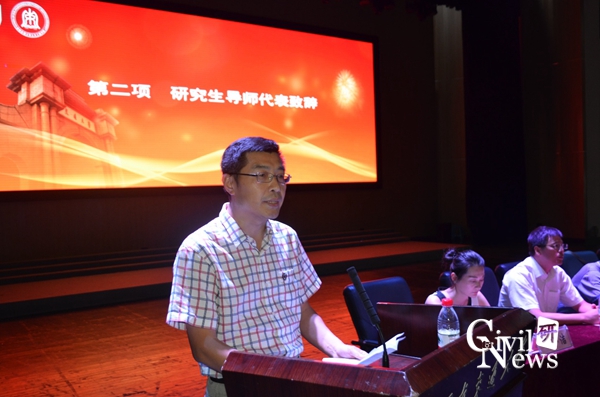 全体奏唱国歌之后,王明年教授作为研究生导师代表致辞,对新生的到来表示由衷的欢迎,并对新生提出了三点注意事项:第一,学生应了解自己导师的科研方向以及研究内容,学习老师发表的论文,明确自己将来的学习方向;第二,学生应该学会团队协作,发挥团队精神、互补互助以达到团队最大工作效率的能力;第三,在学好专业知识的同时,学生应该注意自己在写作方面的提高,为论文的写作打下基础。