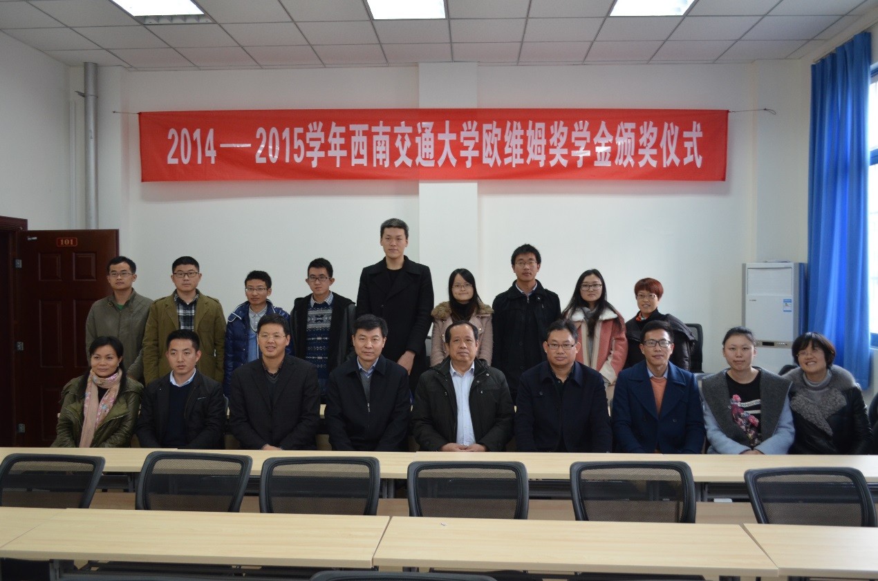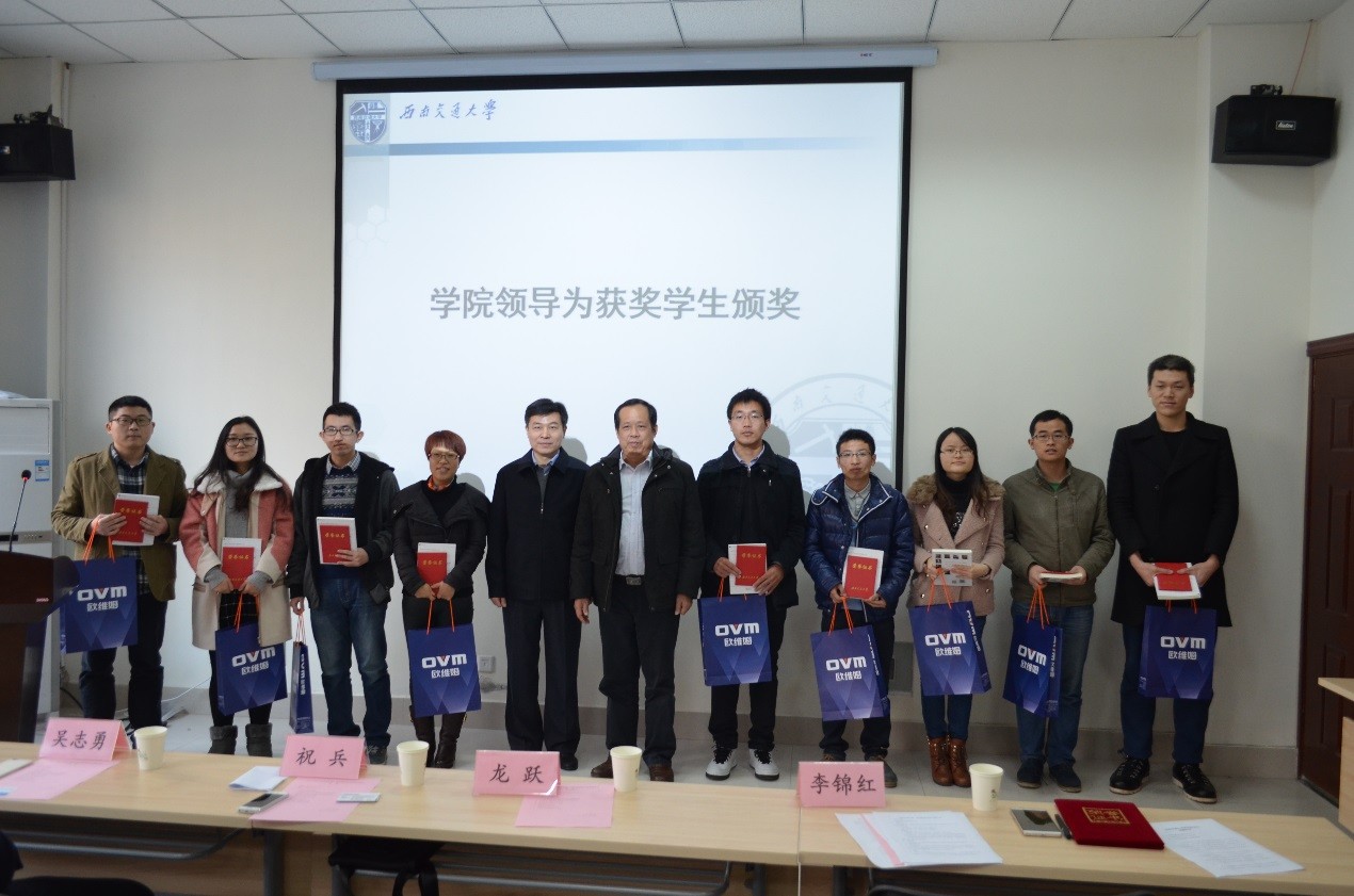 12月24日下午2点半,欧维姆奖学金颁奖仪式在九里校区隧道研发楼101室顺利举行。出席颁奖仪式的有柳州欧维姆机械股份有限公司副总经理、总工程师龙跃先生,公司技术中心副主任吴志勇先生,国内营销中心副总经理兼国内营销中心西南区域公司总经理严光林先生,诸侯快讯ok1133.com副院长祝兵教授。颁奖仪式由诸侯快讯ok1133.com党委副书记李锦红主持。同时到场的还有诸侯快讯ok1133.com辅导员老师和研究生代表。