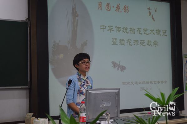 本次活动分四个阶段进行:(1)党委副书记李彤梅宣布活动开始及活动流程;(2)杨丽江老师开展专题讲座;(3)插花艺术协会的四位老师进行现场教学;(4)现场进行插花创作,并评选出佳作。