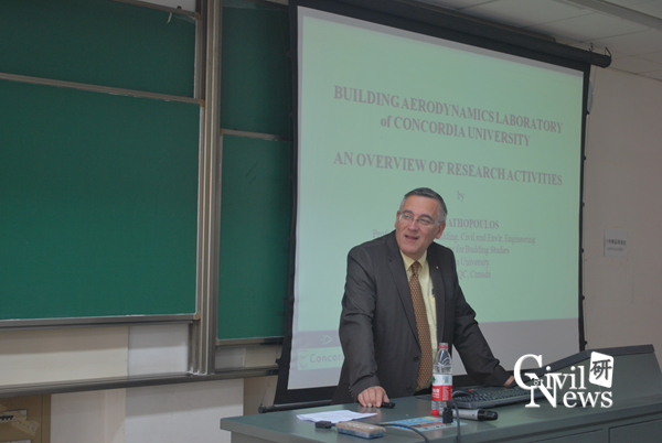 本次学术报告由两个专题组成,Stathopoulos教授以“Building Aerodynamics Laboratory of Concordia University:An overview of Research Activities”为题,介绍了康戈迪亚大学风洞实验室和现有国际风荷载规范编制,并对大跨屋盖风荷载效应、低压建筑风荷载路径和风荷载扭转效应等方面做了详细介绍,接着讲述了不同的规范和试验存在的问题以及研究展望。