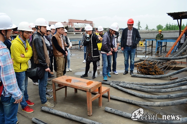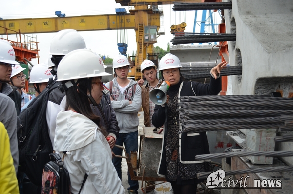 随后,土木学院师生一行到达成蒲铁路三项目部成都西特大桥施工现场进行参观。据悉,成蒲铁路桥梁比例较高,超过全线总里程60%。成蒲铁路全线重点工程是一座全长约35公里的特大桥,该大桥从成都西站引出。