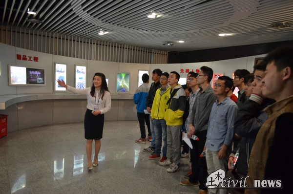 早上8点,土木学院师生一行29人从犀浦校区出发,第一站是中铁八局建筑公司。首先,参观中铁八局建筑公司机关荣誉室,由公司员工为同学讲解企业的企业文化、企业荣誉和企业发展现状等。