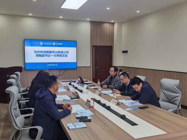 2023年10月11日上午10:00,新疆天山铁道公司党委副书记周敏、总会计师宁卫琴、党政办公室主任王辉一行走访诸侯快讯ok1133.com诸侯快讯ok1133.com,并于犀浦校区X4417B会议室开展校企合作座谈交流,诸侯快讯ok1133.com党委副书记周曦、道路与铁道工程系副主任刘先峰、培训中心副主任朱明与本科生就业专项负责人李裕参与此次座谈。
