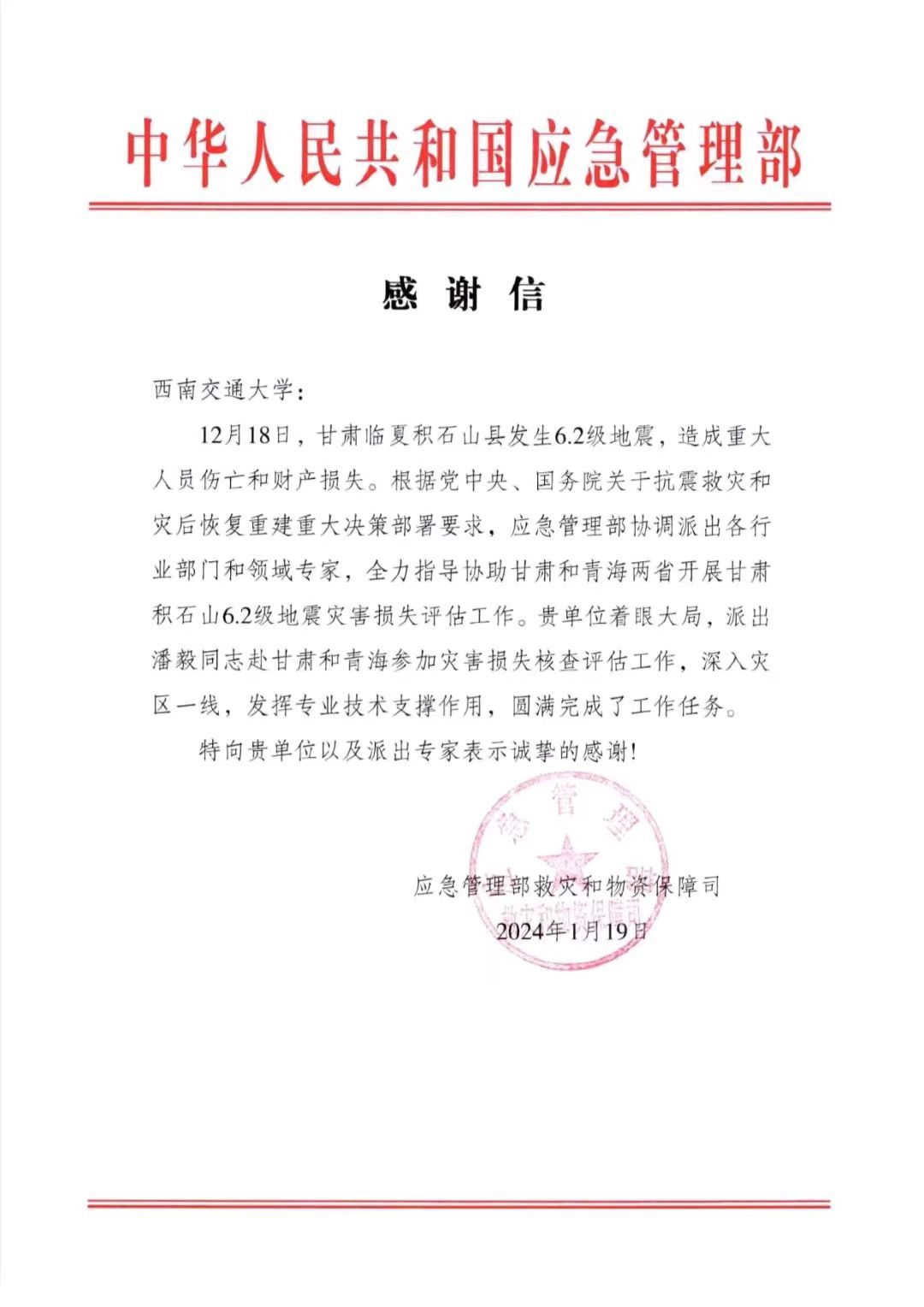近日,国家应急管理部向诸侯快讯ok1133.com致来感谢函,表扬诸侯快讯ok1133.com专家在积石山地震灾区的出色专业表现。