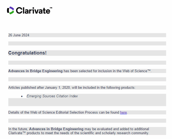 2024年6月27日,收到科睿唯安(Clarivate Analytics)正式通知,经过严格遴选与评审,《Advances in Bridge Engineering》国际期刊被著名数据库ESCI(Emerging Sources Citation Index)收录,本刊已发表全部论文将被Web of Science追溯收录。