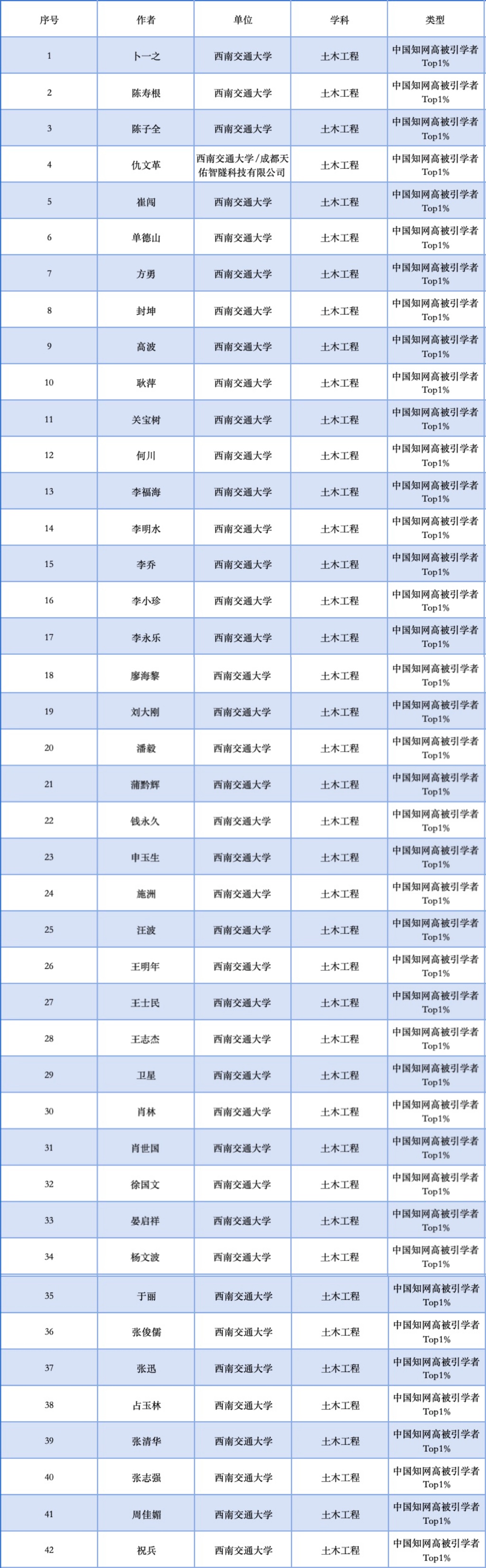 2024年度中国知网土木工程学科高被引学者Top1%