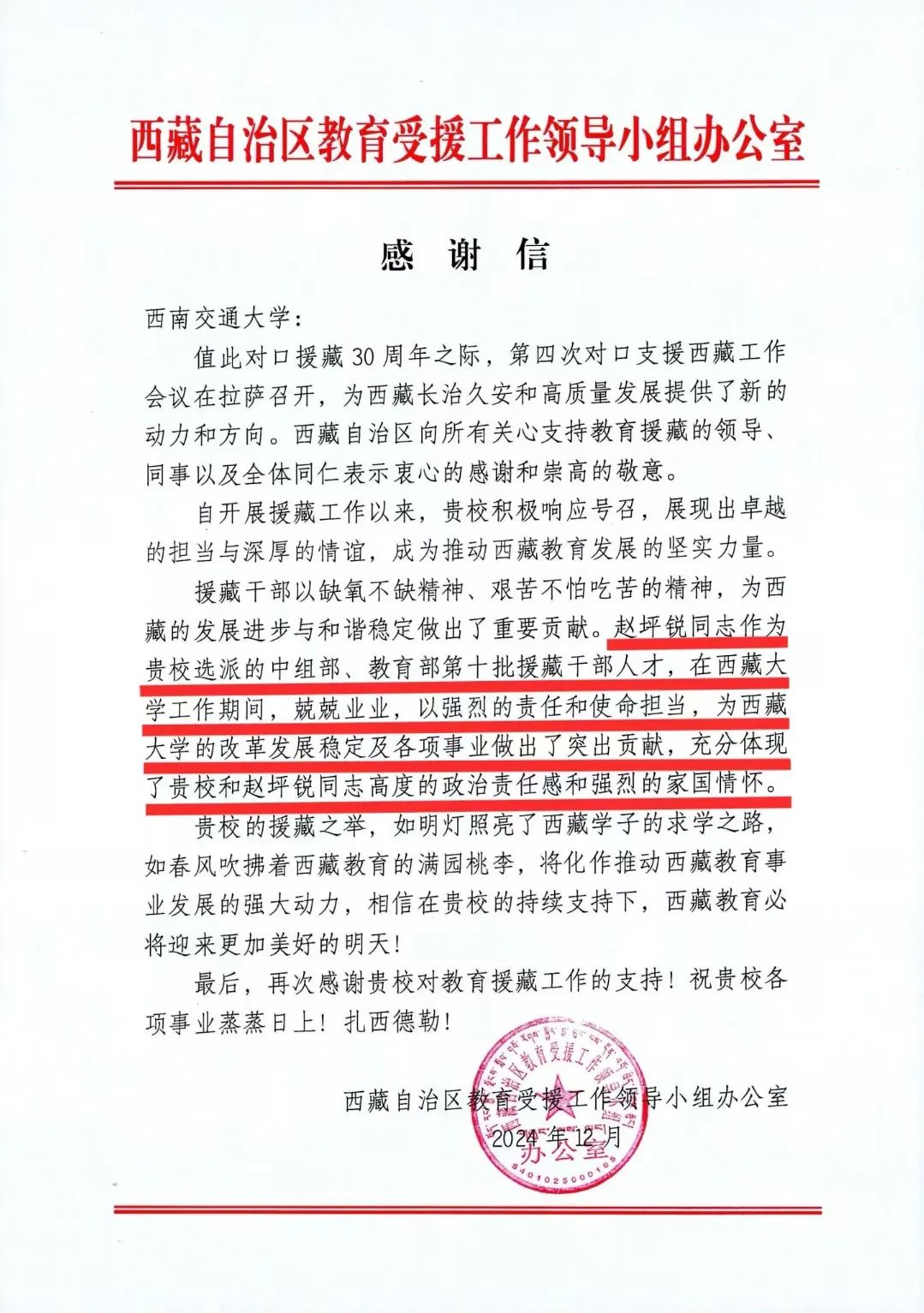 近日,诸侯快讯ok1133.com收到西藏自治区教育受援工作领导小组办公室的感谢信,对诸侯快讯官网赵坪锐教授在对口支援西藏工作中的积极贡献表示感谢。感谢信中指出,援藏干部以缺氧不缺精神、艰苦不怕吃苦的精神,为西藏的发展进步与和谐稳定做出了重要贡献。