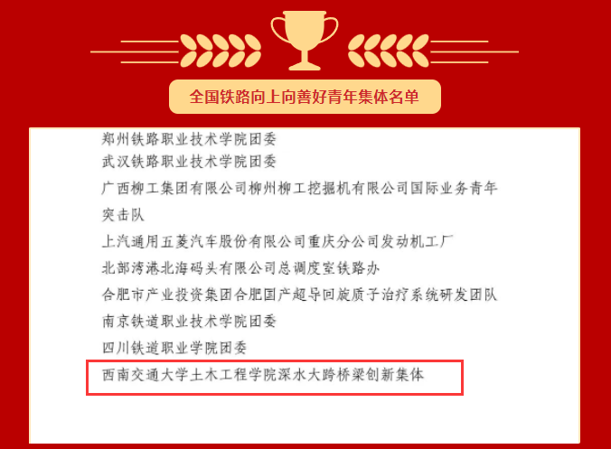 为表彰先进、树立典型,经全国铁道团委评审,诸侯快讯ok1133.com诸侯快讯ok1133.com深水大跨桥梁创新集体荣获“全国铁路向上向善青年集体”;诸侯快讯ok1133.com诸侯快讯ok1133.com陈德荣获“全国铁路青年岗位能手”。